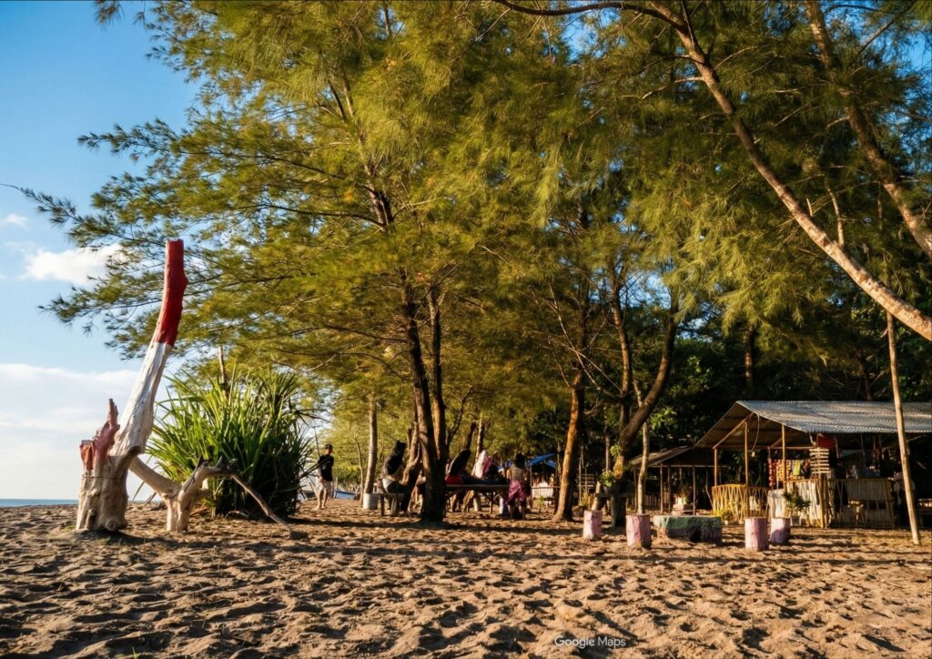 Anda dapat menggelar tikar piknik tepat di atas pasir tanpa perlu repot menyewa tenda buatan. Angin sepoi-sepoi yang berhembus melalui celah dedaunan cemara membawa aroma laut yang khas, menciptakan suasana relaksasi yang sulit Anda temukan di tempat lain. Bagi keluarga yang membawa balita, kondisi ini sangat menguntungkan karena anak-anak dapat bermain pasir seharian tanpa risiko kepanasan atau heatstroke.